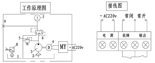 工作原理 “AP”自動(dòng)泵工作原理:將間歇時(shí)間、工作時(shí)間設(shè)定后,“MY”型控制器控制電機(jī)4的工作和間歇。電機(jī)4得電,驅(qū)動(dòng)齒輪泵3運(yùn)轉(zhuǎn)。通過(guò)吸油濾網(wǎng)2從油箱1吸入潤(rùn)滑油,經(jīng)自動(dòng)換向閥6 壓送至輸出口9 輸往系統(tǒng)。電機(jī)失電,停止泵油,換向閥6 在差壓信號(hào)的作用下恢復(fù)至左位機(jī)能,溝通主管路卸荷通道。系統(tǒng)壓力經(jīng)自動(dòng)換向閥6 快速卸荷到油箱。系統(tǒng)壓力由調(diào)壓閥5控制,壓力表7 顯示。液位開(kāi)關(guān)8隨時(shí)檢測(cè)油位,輸出無(wú)源常開(kāi)信號(hào)。