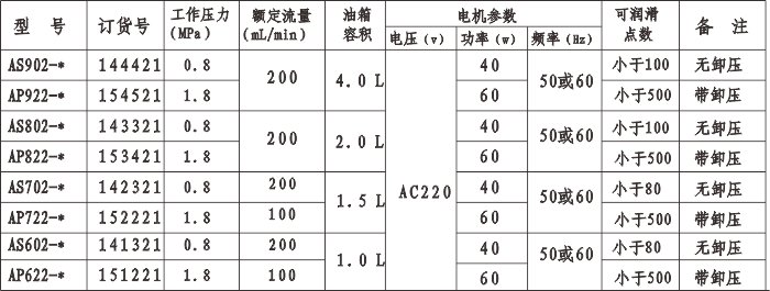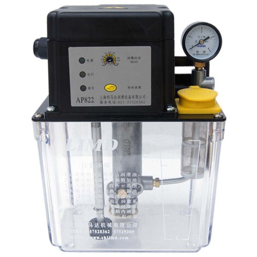 “AP822”系列自動(dòng)潤(rùn)滑泵是一種電機(jī)驅(qū)動(dòng)齒輪泵。含“MY”型控制器、自動(dòng)卸荷閥、液位開(kāi)關(guān)等。屬間歇工作泵。用于需周期工作的容積式定量集中潤(rùn)滑系統(tǒng)。接通電源,即可自動(dòng)工作。具有液位報(bào)警、輸出聯(lián)控信號(hào)等功能。 工作電源:AC220V;50~60Hz 功率: 60W; 額定壓力:1.8MPa; 額定流量:200ml/min。 適用潤(rùn)滑介質(zhì):N32#~N68#。 “AP822”系列自動(dòng)潤(rùn)滑泵廣泛應(yīng)用于機(jī)床、紡機(jī)、印機(jī)、塑機(jī)、電梯、木工、食品、包裝等機(jī)械設(shè)備的潤(rùn)滑。