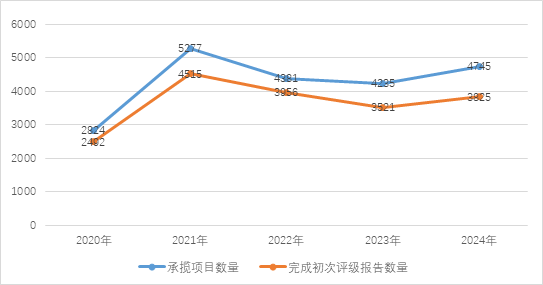 近5年來,公司承攬項(xiàng)目數(shù)量以年均14%的速度增長;完成初次評(píng)級(jí)項(xiàng)目數(shù)量均以年均11%的速度增長。
